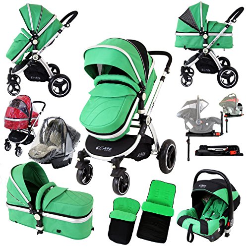 i-Safe System + iSOFIX Base - Leaf Trio Travel System Pram & Luxury Stroller 3 in 1 Complete With Car Seat + Footmuff + Carseat Footmuff + RainCovers
